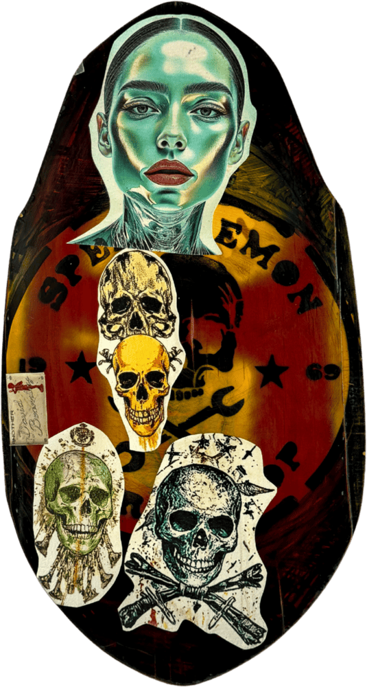 This original skim board has been individually painted by iconic Australian artist David Bromley featuring skulls on both sides.