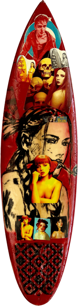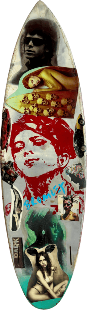 Each board begins as a pre-loved piece, carefully sourced and restored before being reimagined through Bromley’s unmistakable pop-art language. Traces of its former life are intentionally preserved, adding depth, character and authenticity to every work. Layered with expressive colour and signature Bromley motifs, each board is a one-off original artwork that bridges surf culture, nostalgia and pop art, offering a rare opportunity to acquire an original Bromley work in a unique sculptural (and functional) form.