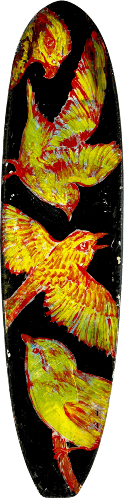 This original surfboard has been individually painted by iconic Australian artist David Bromley featuring a naked woman laying down on the front and red and yellow birds on black on the back.
