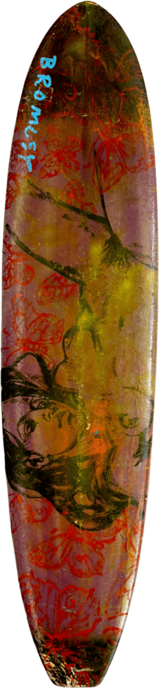 Each board begins as a pre-loved piece, carefully sourced and restored before being reimagined through Bromley’s unmistakable pop-art language. Traces of its former life are intentionally preserved, adding depth, character and authenticity to every work. Layered with expressive colour and signature Bromley motifs, each board is a one-off original artwork that bridges surf culture, nostalgia and pop art, offering a rare opportunity to acquire an original Bromley work in a unique sculptural (and functional) form.