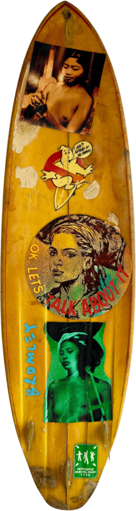 Each board begins as a pre-loved piece, carefully sourced and restored before being reimagined through Bromley’s unmistakable pop-art language. Traces of its former life are intentionally preserved, adding depth, character and authenticity to every work. Layered with expressive colour and signature Bromley motifs, each board is a one-off original artwork that bridges surf culture, nostalgia and pop art, offering a rare opportunity to acquire an original Bromley work in a unique sculptural (and functional) form.